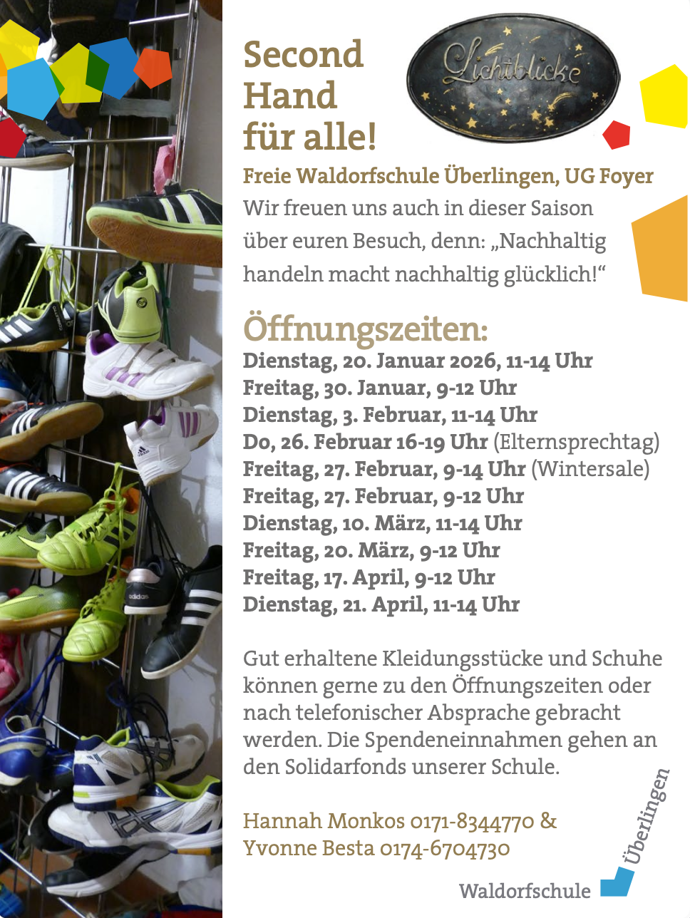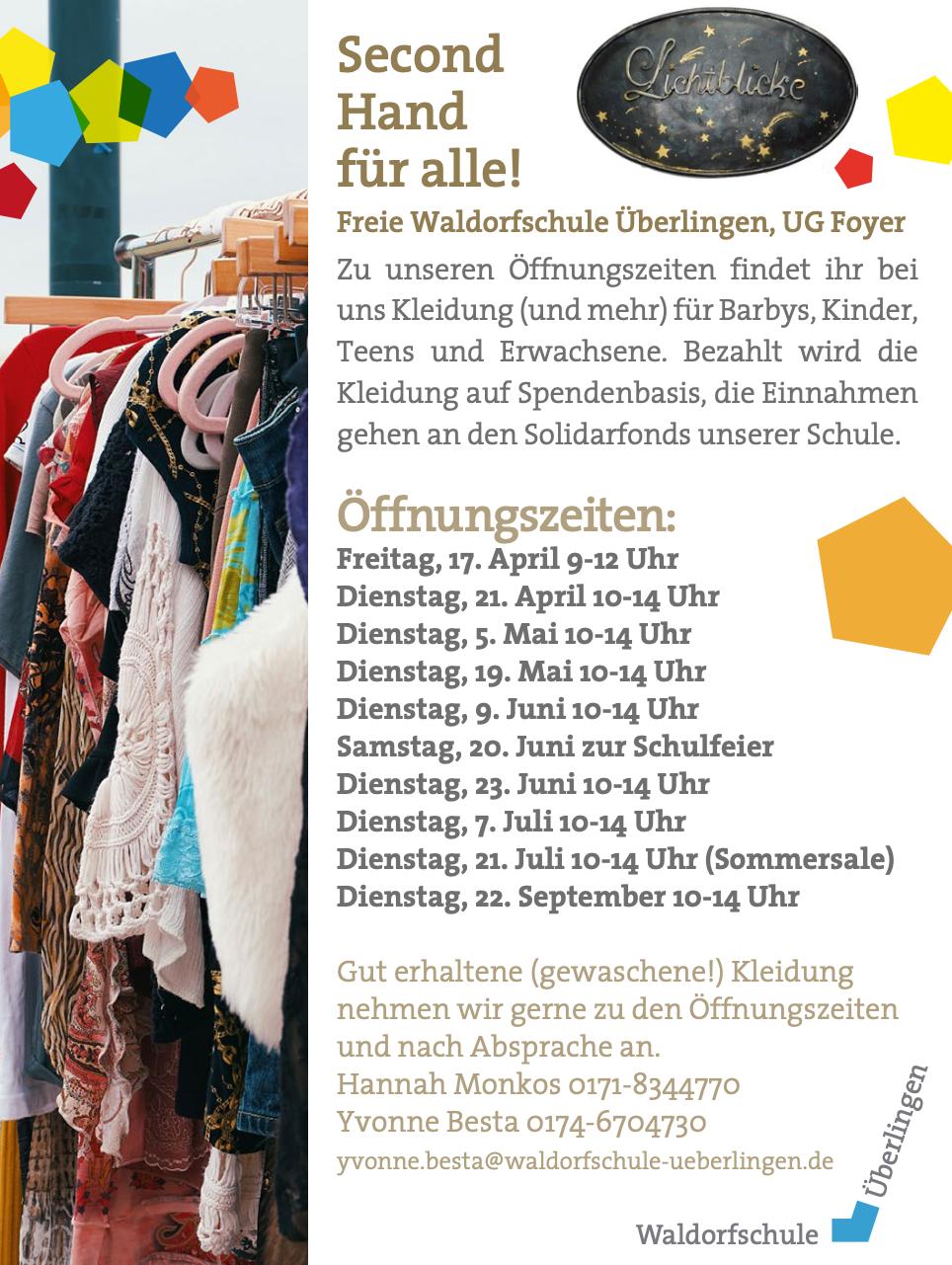 Die Second Hand-Kleiderstube "Lichtblicke" ist mittlerweile eine feste Institution in unserer Schule - frei nach Motto "Nachhaltig handeln macht nachhaltig glücklich" hat sie regelmäßig geöffnet - es lohnt sich, hier nach hochwertiger, gut erhaltener Second Hand Kleidung zu stöbern, übrigens für Kinder und Erwachsene. Die Einnahmen kommen dem Solidarfonds der Schule zugute, Kleiderspenden werden gern entgegengenommen. Die nächsten Öffnungstermine finden Sie hier: