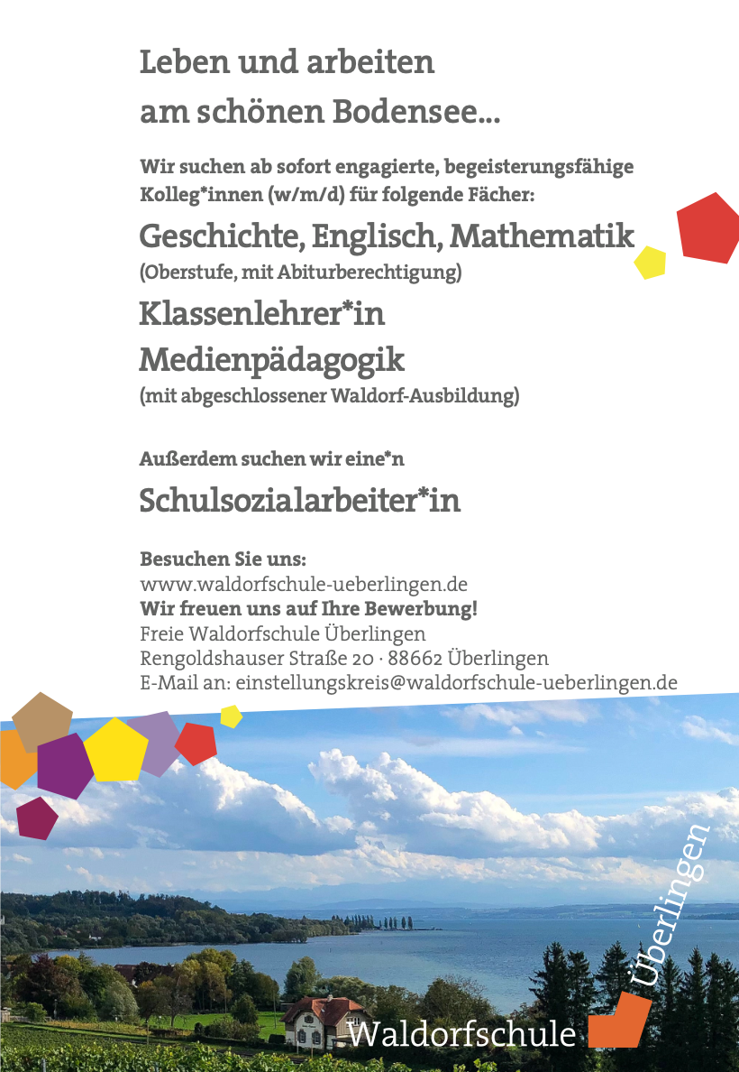 Besonders hinweisen möchten wir hier in Überlingen natürlich auf „unser“ Seminar vor Ort, das die Möglichkeit anbietet, berufsbegleitend in diesen wunderschönen Beruf hineinzuwachsen: www.lehrerseminar-ueberlingen.de